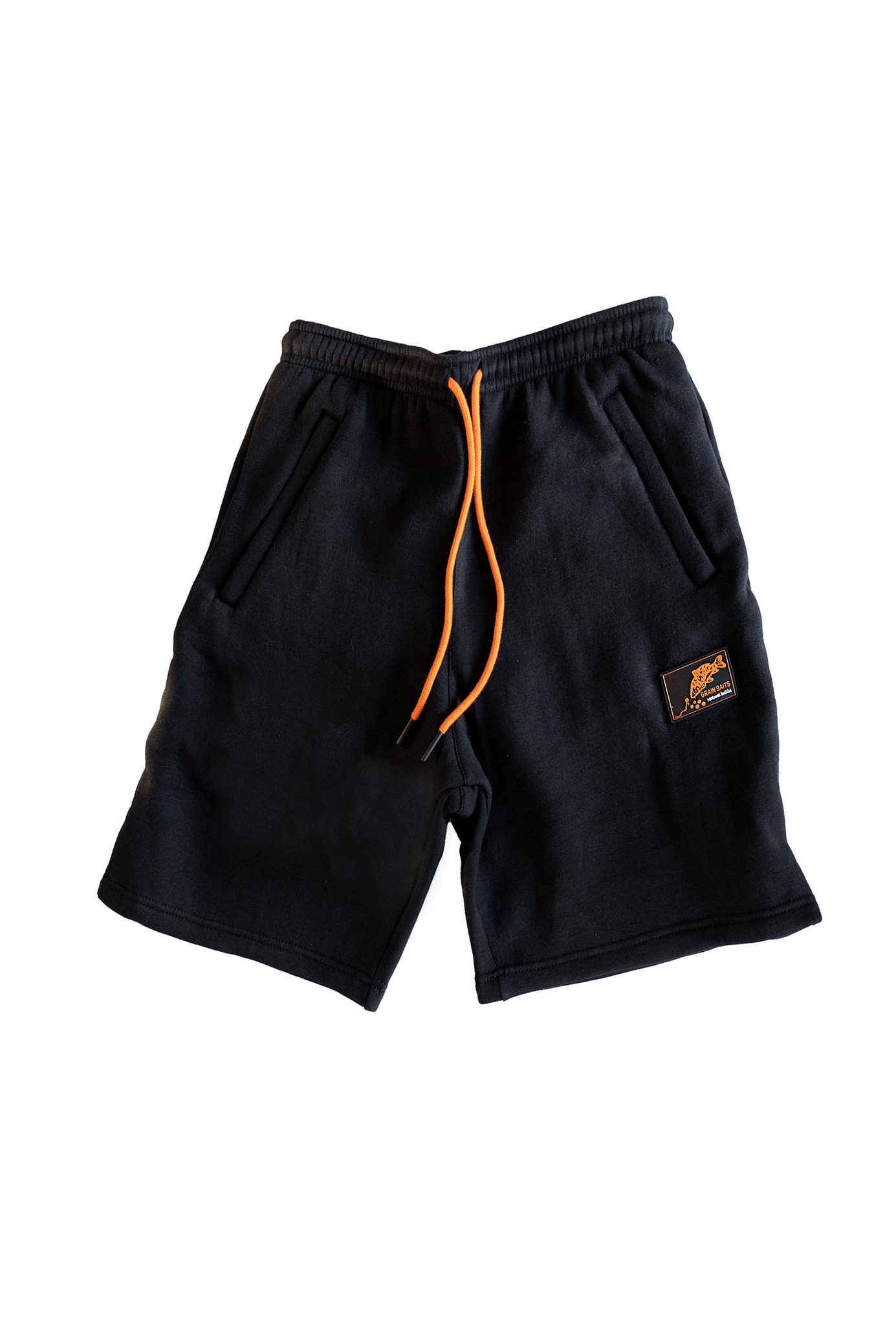 - Die Kleidung ist schwarz mit einem orangefarbenen Touch in den Logos und Aufdrucken.