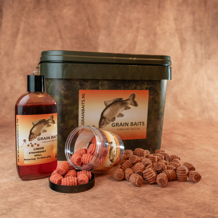 Dit alles zit verpakt in een vierkante Grain Baits emmer.